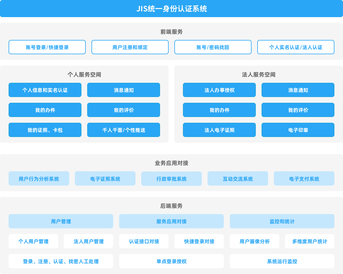 JIS統(tǒng)一身份認證系統(tǒng)可通過控制用戶的訪問實現(xiàn)用戶身份認證以及實名認證,支持通過單點登錄提高使用者的使用體驗,通過角色管理方便對各應用平臺進行授權(quán)管理。系統(tǒng)提供統(tǒng)一的開發(fā)組件和服務,有效進行身份管理,提升使用者的用戶體驗并有效控制用戶行為,實現(xiàn)了統(tǒng)一用戶管理、身份認證、實名認證和單點登錄四個層次的身份管理。