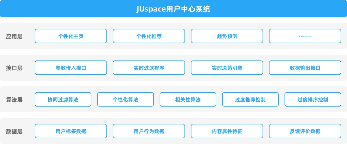 JUspace用戶中心系統可廣泛應用于政府和企業服務領域中的個人、企業主頁,提供個性化、便捷化、智能化專屬服務。系統基于用戶相關信息(年齡、性別、地域、職業等)、用戶行為記錄、辦件信息、事項信息,利用logistic回歸、矩陣分解等算法模型,通過歷史數據訓練得到模型,實現用戶畫像,預測用戶對辦事事項的偏好,并結合分析結果和用戶需求實時推薦最適合的辦事場景和服務。