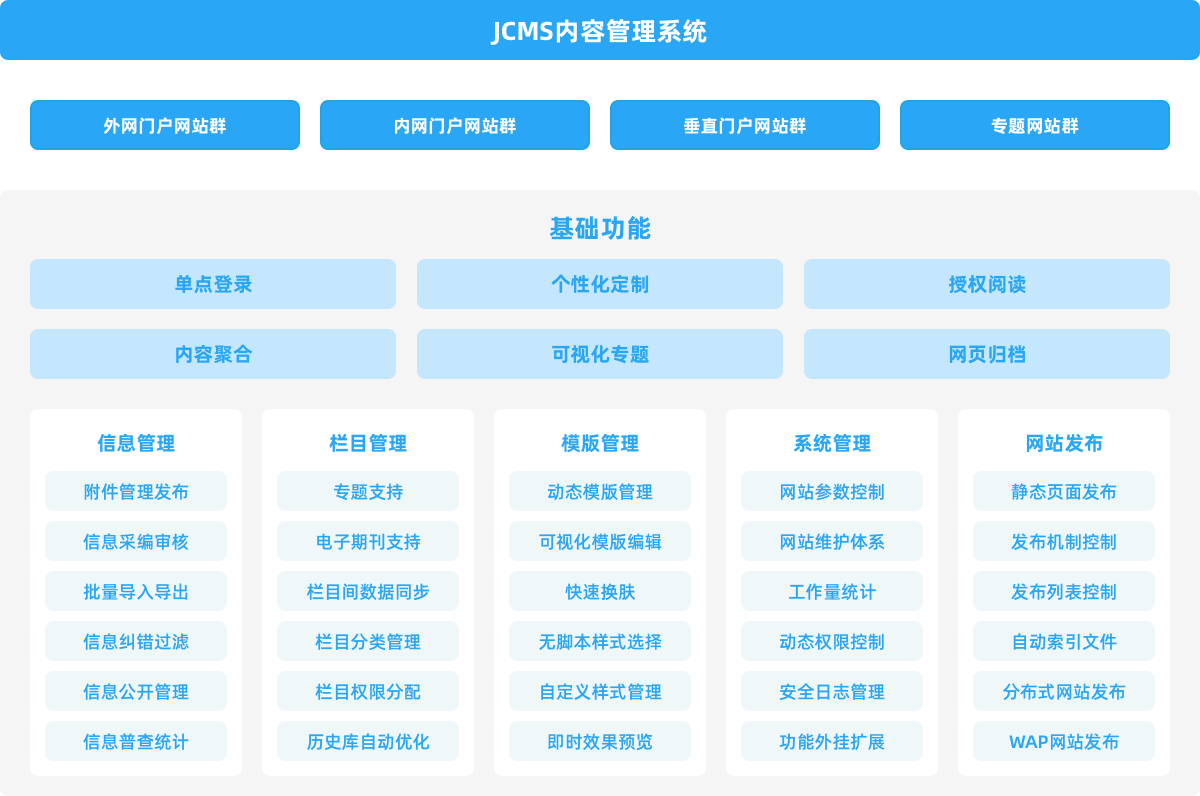 JCMS內(nèi)容管理系統(tǒng)是基于微服務(wù)和分布式技術(shù)架構(gòu),采用前后端分離開發(fā)模式,以全新理念構(gòu)建的內(nèi)容管理系統(tǒng)。系統(tǒng)提供了從內(nèi)容采集、創(chuàng)建、糾錯、審批、歸檔、發(fā)布、展現(xiàn)、共享、統(tǒng)計等信息全生命周期過程中所需的各項(xiàng)功能。