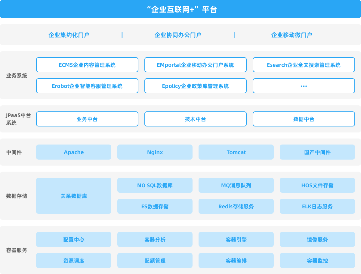 “企業互聯網+”平臺是基于統一信息資源標準、統一技術平臺、統一安全防護和統一運維監管等規劃開發的,面向多服務對象、多渠道、多層級和多部門的內外網一體化企業綜合管理平臺。平臺堅持創新驅動,運用大數據、云計算和人工智能等技術,構建互聯融通的平臺架構,支持新技術、新應用和新功能的無縫對接,能夠隨技術發展變化持續升級和靈活擴展。