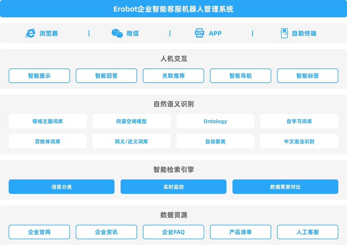 Erobot企業(yè)智能客服機(jī)器人管理系統(tǒng)是基于自然語(yǔ)義識(shí)別分析和智能搜索技術(shù),實(shí)現(xiàn)企業(yè)對(duì)外客服答疑、對(duì)內(nèi)知識(shí)解惑的人機(jī)交互智能客服系統(tǒng)。支持企業(yè)知識(shí)采集和管理、智能交互問(wèn)答、轉(zhuǎn)接人工客服、接收工單服務(wù)等功能,助力企業(yè)打造7*24小時(shí)的在線智能客服,減輕人工客服的工作量。